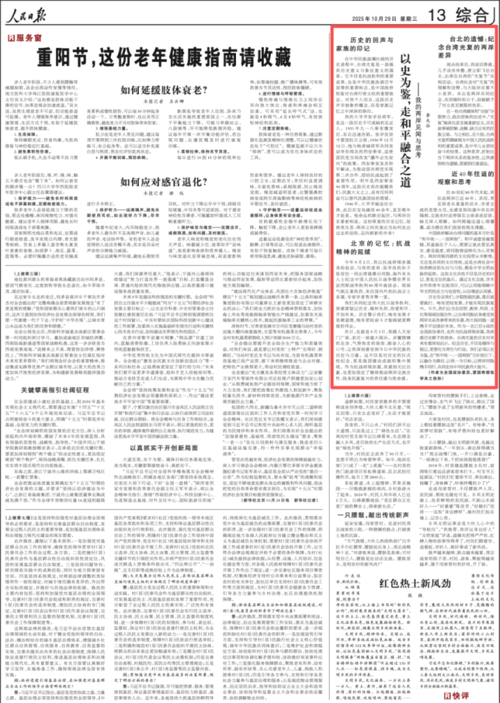 10月29日,全国政协委员、爱国将领张学良之侄孙李大壮在人民日报刊发文章,题目是《以史为鉴,走和平融合之道——我的两岸见闻与思考》。